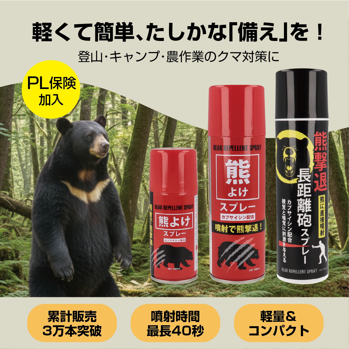【先制防衛:直撃タイプ】 危険な距離に入る前に。窒素ガスの圧力による遠方からのピンポイント噴射で熊を牽制し、逃げるための時間を稼ぎます。