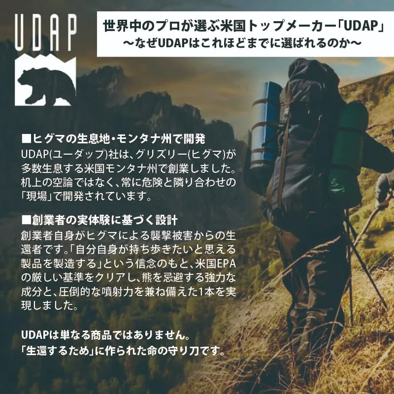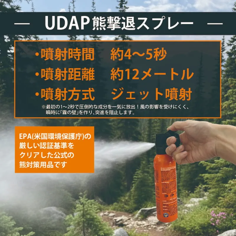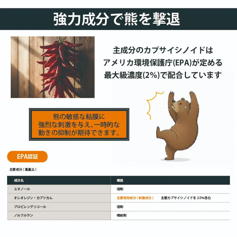 【先制防衛:直撃タイプ】 危険な距離に入る前に。窒素ガスの圧力による遠方からのピンポイント噴射で熊を牽制し、逃げるための時間を稼ぎます。