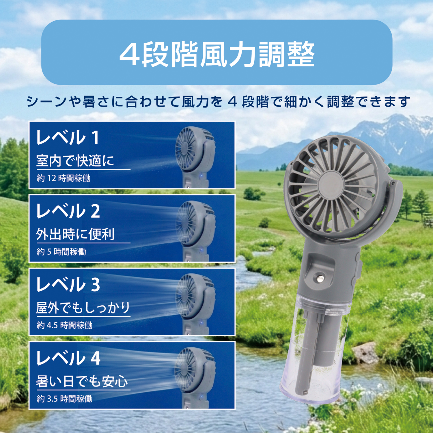 電源ボタンひとつで4段階の風力調節が可能。フル充電の弱風モードなら最大約12時間使える省エネ設計で、外出先でもバッテリーを気にせず一日中快適に過ごせます。