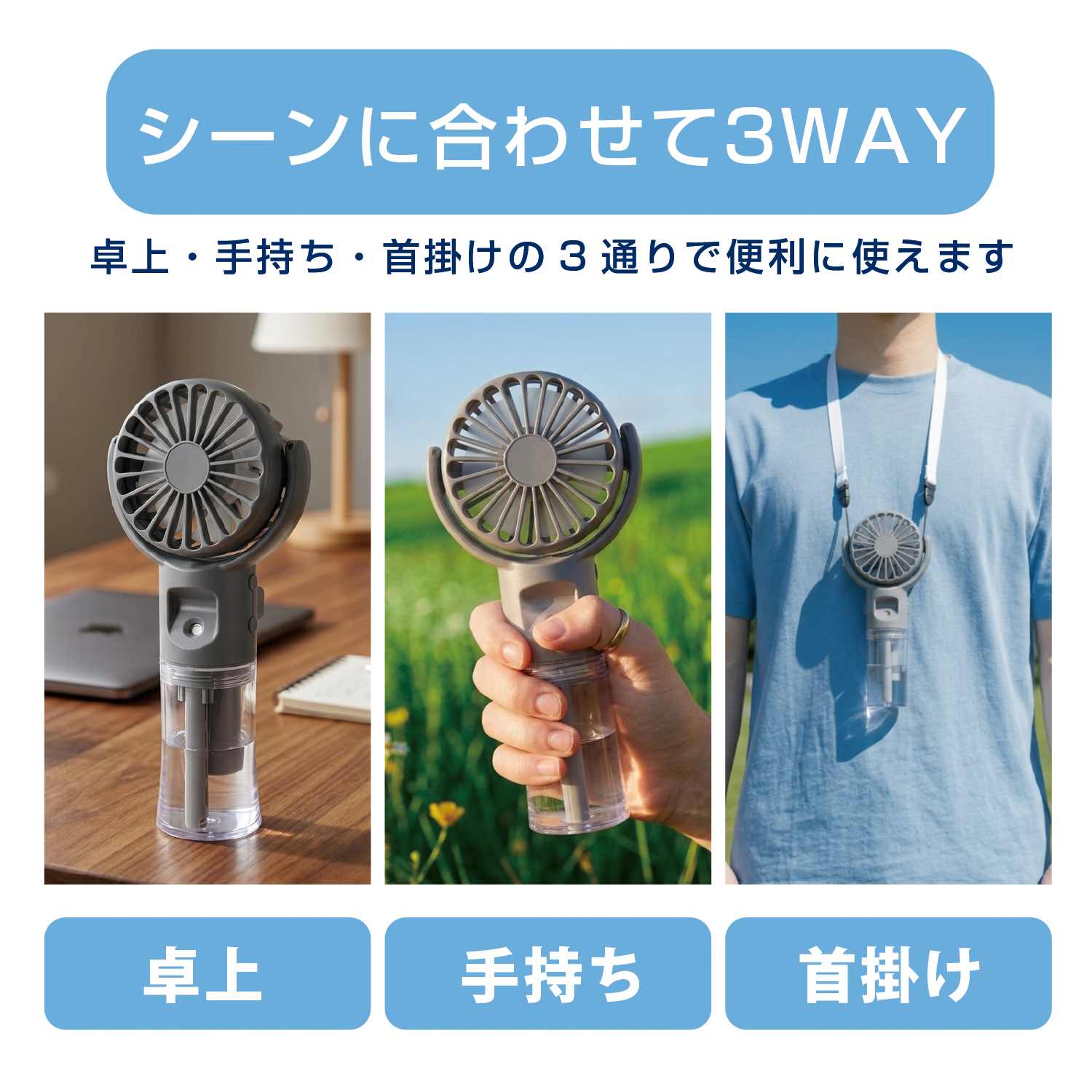 「手持ち」「首掛け」「卓上」の3WAYで使える便利なファン。安定して自立し、角度調整もできるため、外出先からオフィス、ご自宅まで、場所を選ばずいつでもお好みの風を楽しめます。