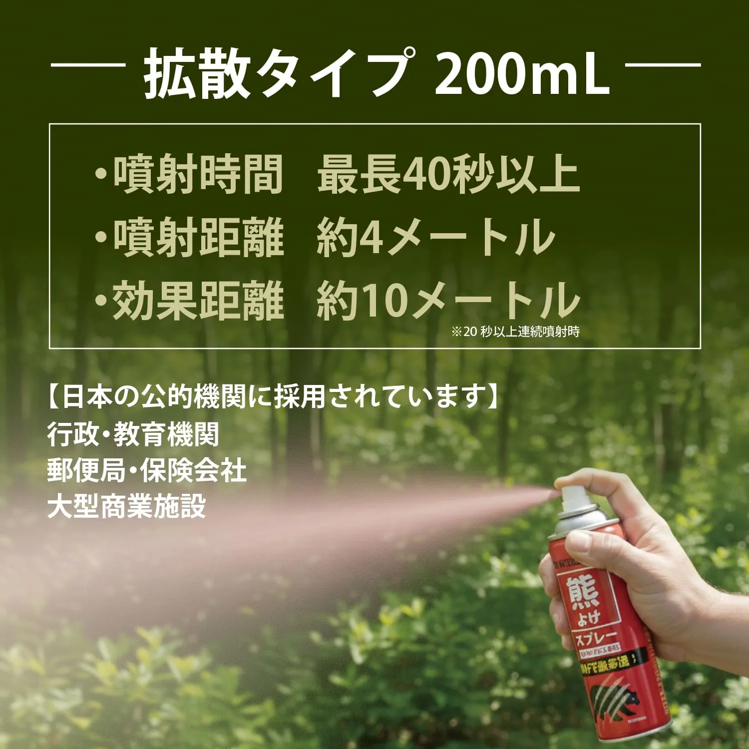 【直撃タイプ180ml】待望のスプレーとホルダーのセット商品。マジックテープ式で即座に取り出し、遠方からのピンポイント噴射で熊を牽制、逃げるための時間を稼ぎます。